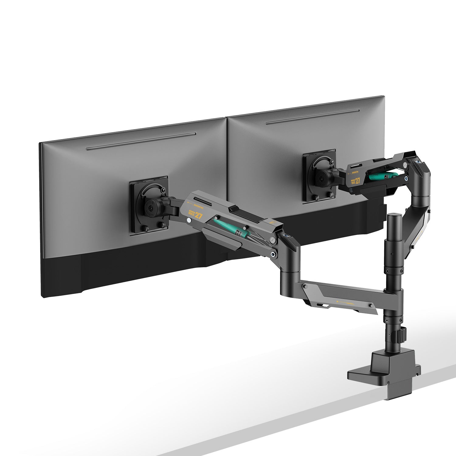 頑丈な支柱に2つのアームを固定し、2画面の大型モニターをレイアウト。